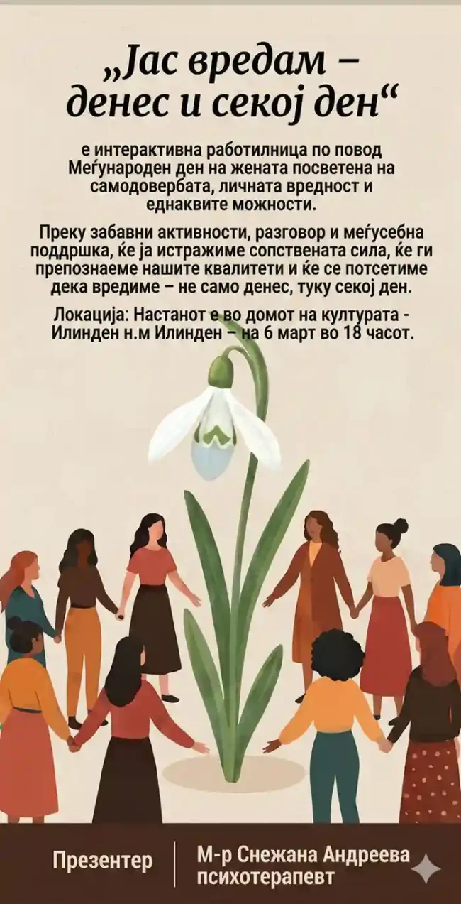 По повод Меѓународниот ден на жената 8-ми март Општина Илинден во соработка со Комисијата за еднакви можности организира интерактивна работилница посветена на самодовербата, личната вредност на жената како и еднаквите можности „Јас вредам – денес и секој ден“.